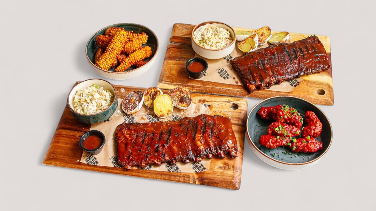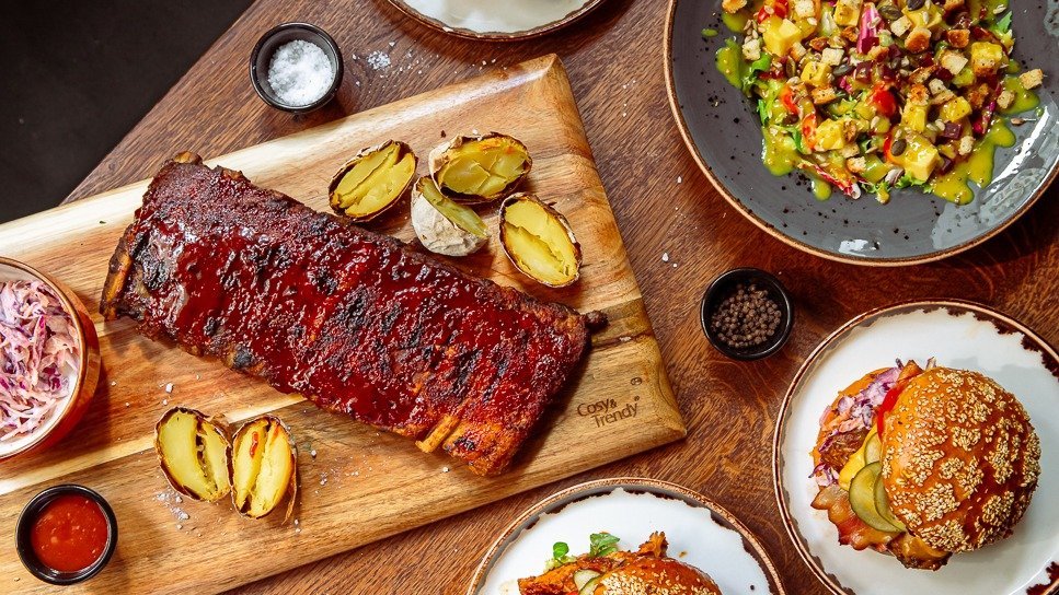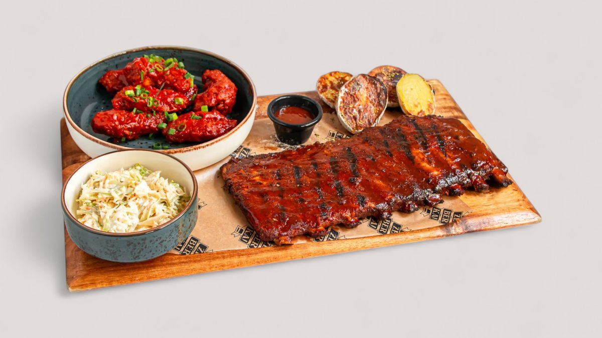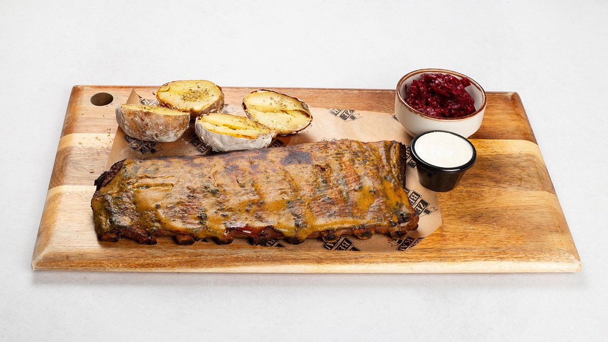 Wolnopieczony a następnie grillowany wielki pasek żeberka wieprzowego. Do tego pieczone ziemniaki, colesław i sos BBQ klasyczny lub ostry
