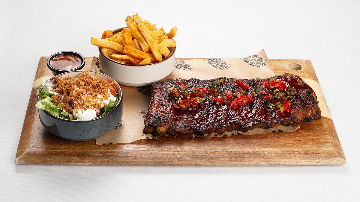 Wolnopieczony a następnie grillowany wielki pasek żeberka wieprzowego z autorskim sosem BBQ na bazie Jim Beam, posypany ostrymi papryczkami kandyzowanymi w miodzie. Do tego frytki i sałatka