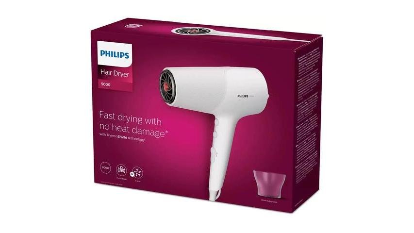 Uscator de par Philips BHD500/00, 2100W, ThermoShield, Ionizare, 2 setari de viteza, 3 setari de temperatura, Alb