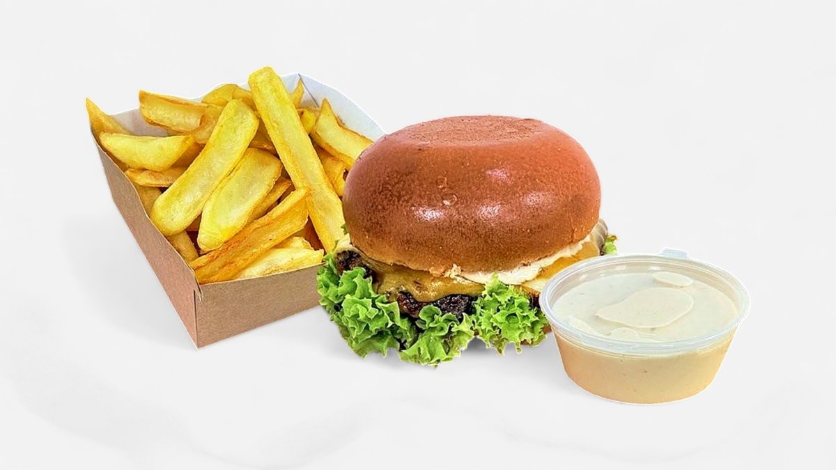 Chiflă unsă cu unt, 2xpaline din carne de vită(90gr.fiecare palină), sos Bodeguita, 2xfelie brânză Cheddar, ceapă caramelizată. Inclus: Cartofi prăjiți(150gr.) Sos la alegere(60ml.) 450 gr.