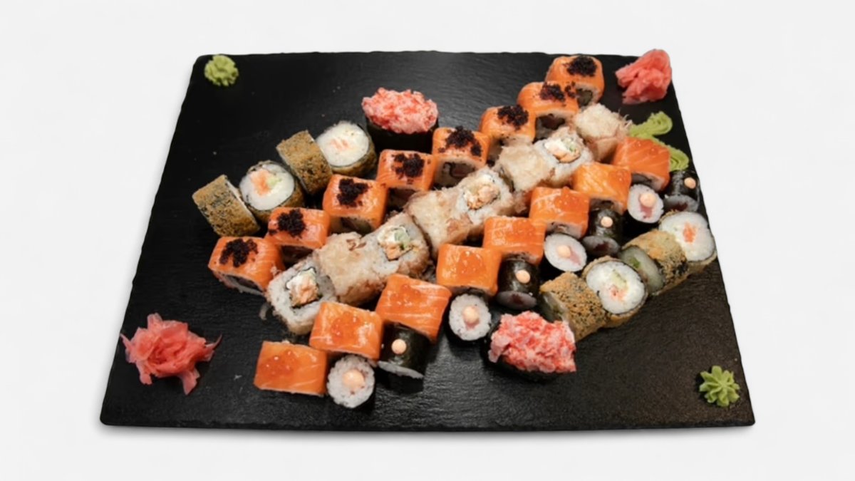 Crispy salmon&tuna, philadelphia clasic, kunsei roll, geen dragon, shrimp vulcano, black unagi, shrimp tempura, coconut shrimp, salmon maki, maki avocado, tamago temaki, salmon temaki. (82 buc.) Ghimbir, wasabi, sos de soia si bete sushi incluse . cca.2080g