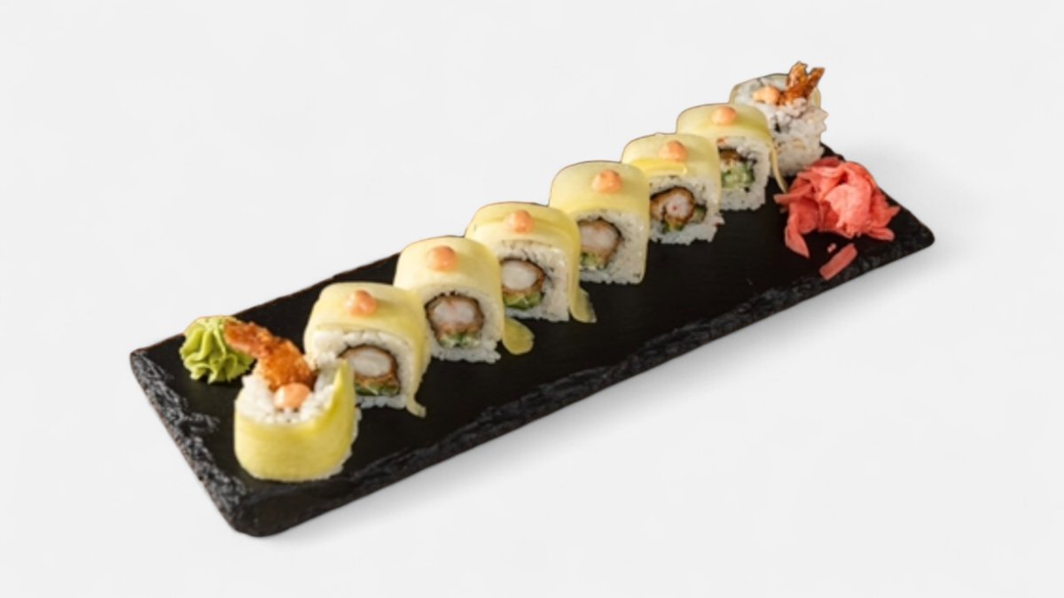 Crispy mango shrimp, kunsei roll, shrimp tempura, geen dragon, salmon maki.(40 Buc.) Ghimbir, wasabi, sos de soia si bete sushi incluse . cca.955g
