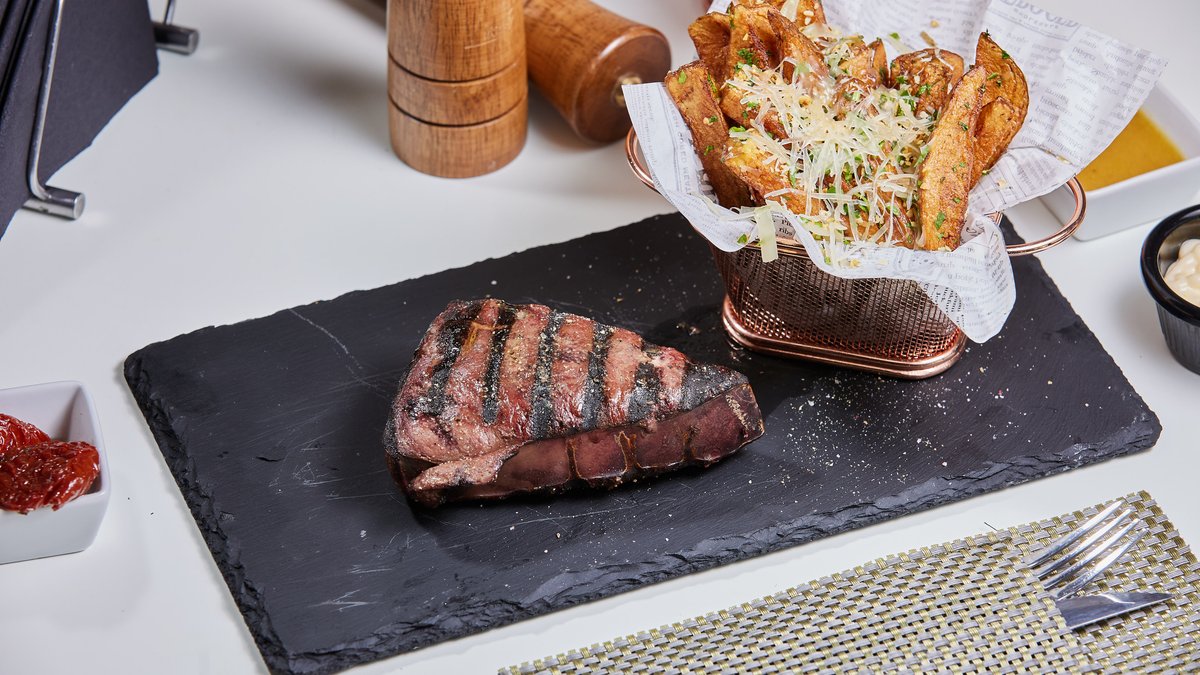 Carne vită Black Angus, chiflă, roșii uscate, brânză cheddar, bacon, sosul casei, sos pesto, rucola + Cartofi proaspeți prăjiți (490 g)