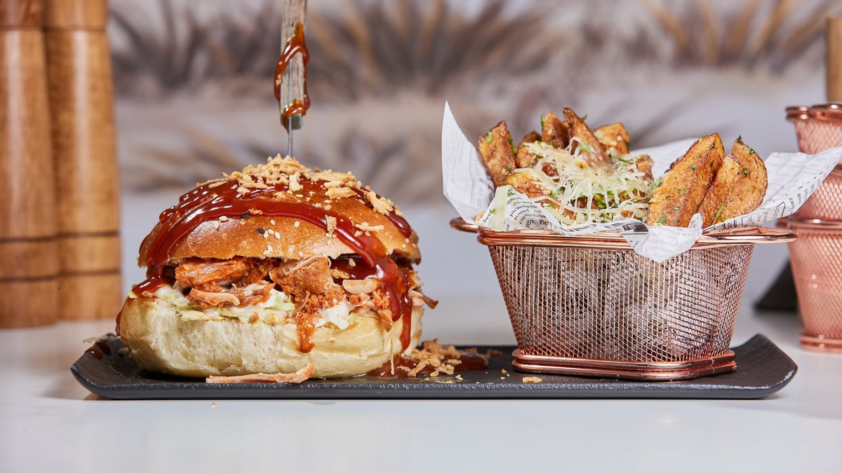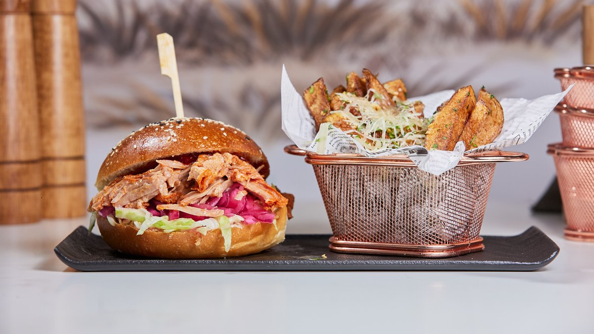 Carne Pulled pork, chiflă, sos barbeque, maioneză, morcov, varză, ceapă prăjită + Cartofi proaspeți prăjiți (460 g)