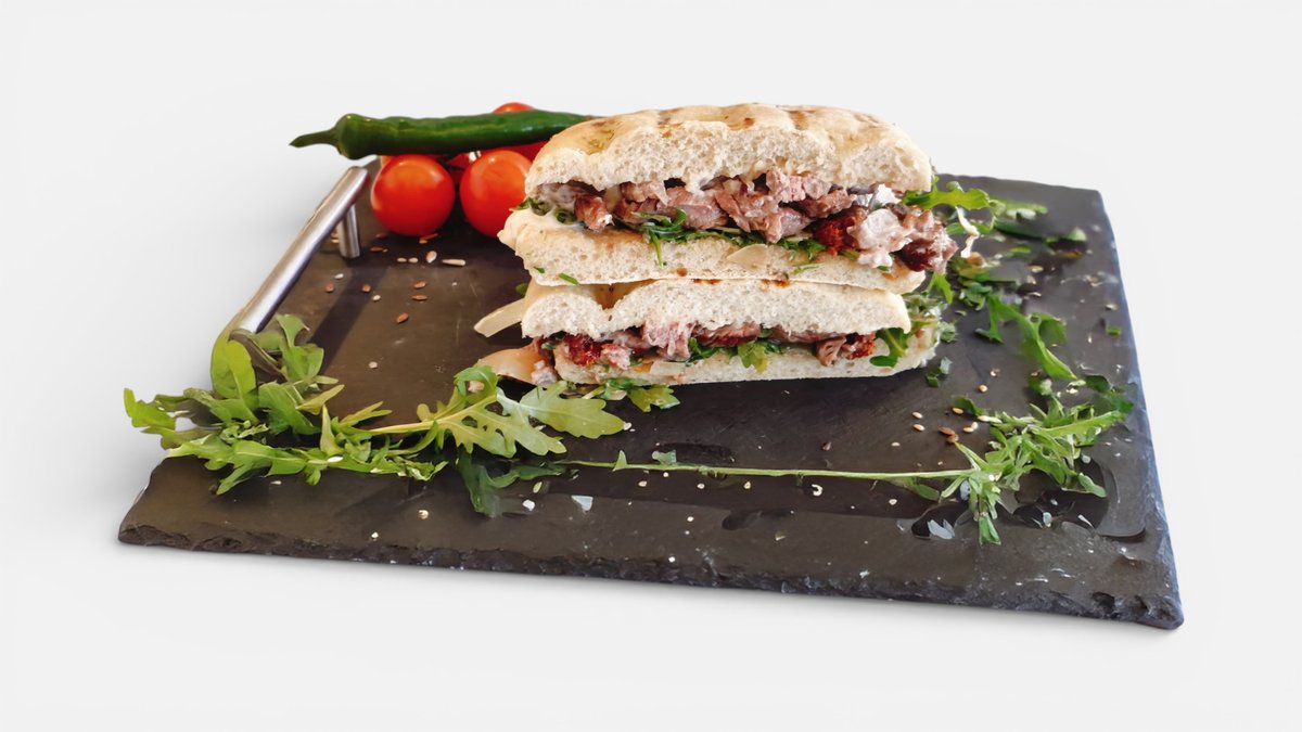 Focaccia, sottofiletto vită Black Angus, roșii uscate, parmezan, rucola, sos Aioli (315g)