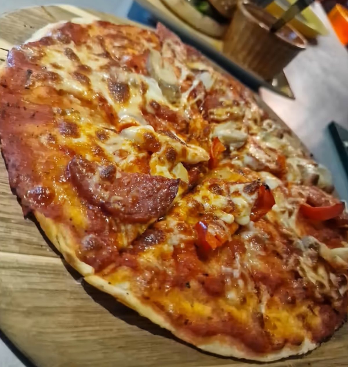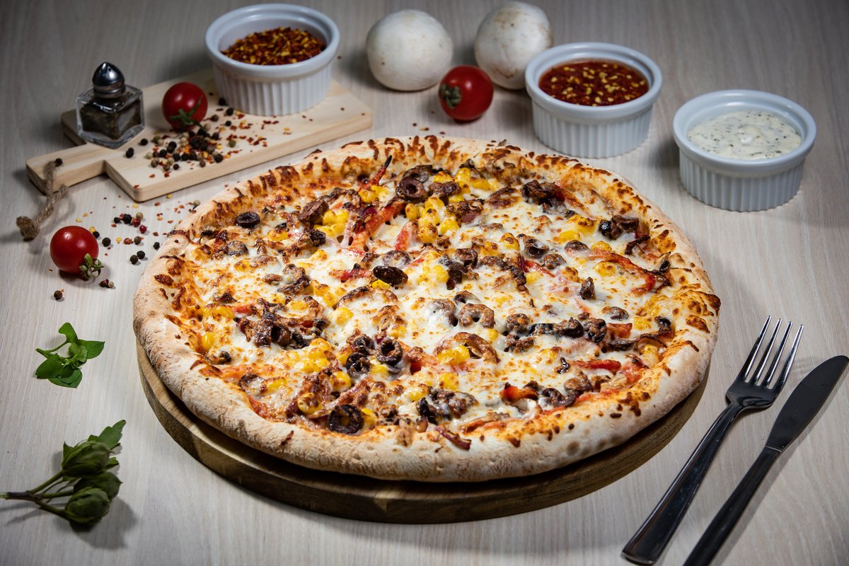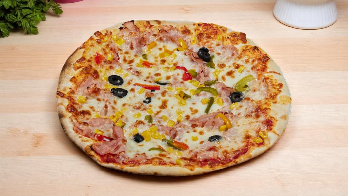 Sos, mozzarella, salam, kaizer, șuncă, pastramă, măsline, ciuperci, ardei, ceapă 600g