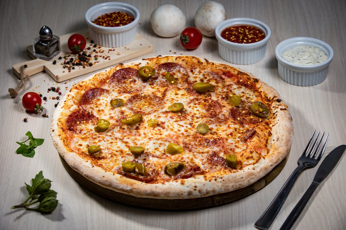 Sos, mozzarella, pastramă, șuncă, cabanos, ardei, măsline 640g