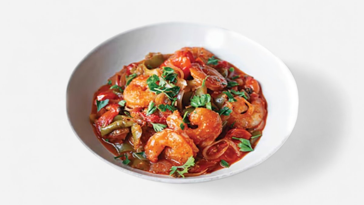 creveti, rosii cherry, ardei iute, usturoi, sos de rosii, ulei de masline, patrunjel, sare 300g • 195 kcal / 100g