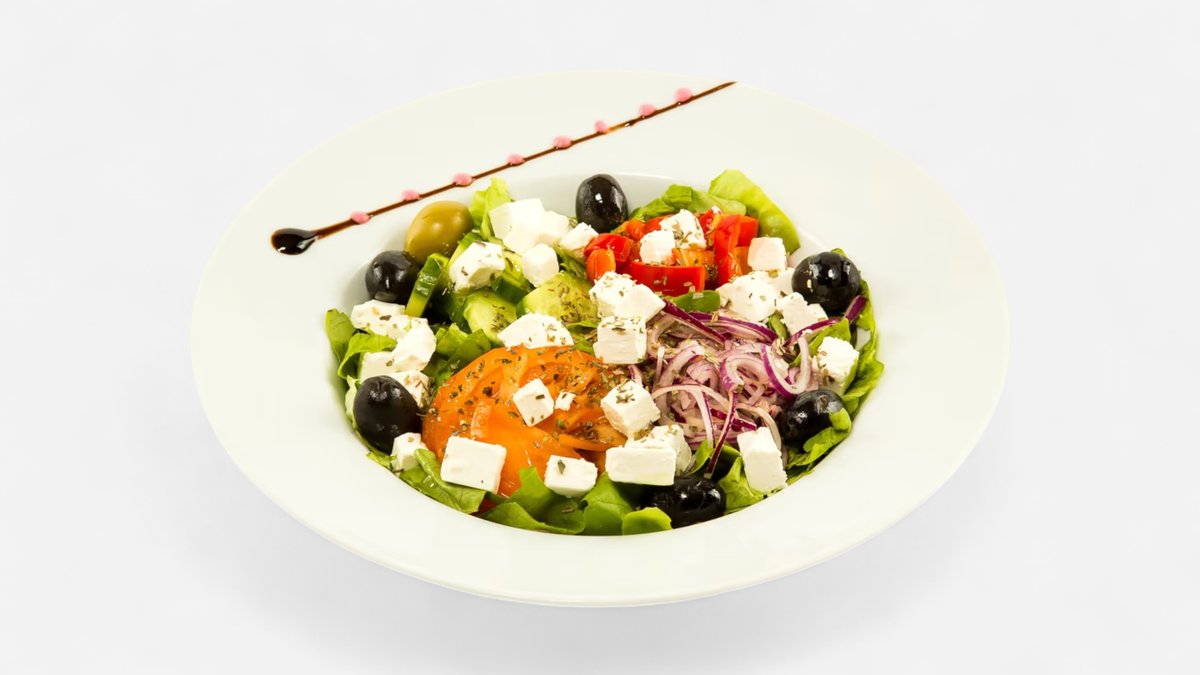 Salată verde, brânză feta, roșii, castraveți, ardei gras, ceapă roșie, măsline negre, oregano, ulei de măsline 450g