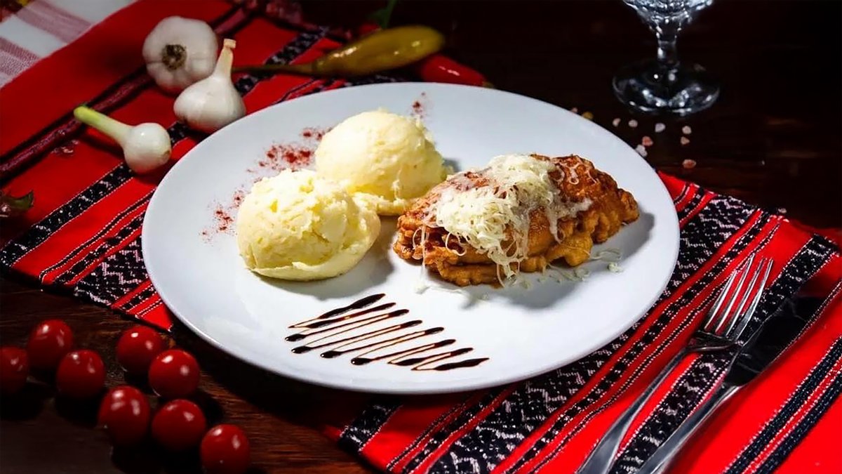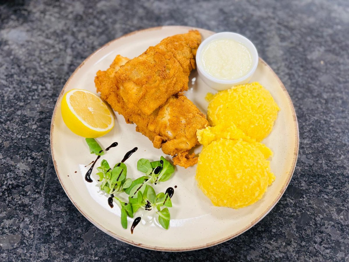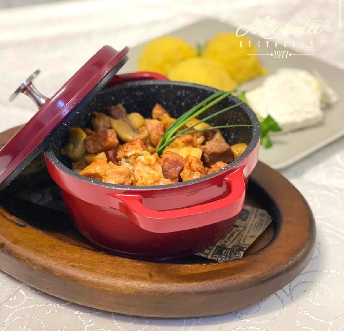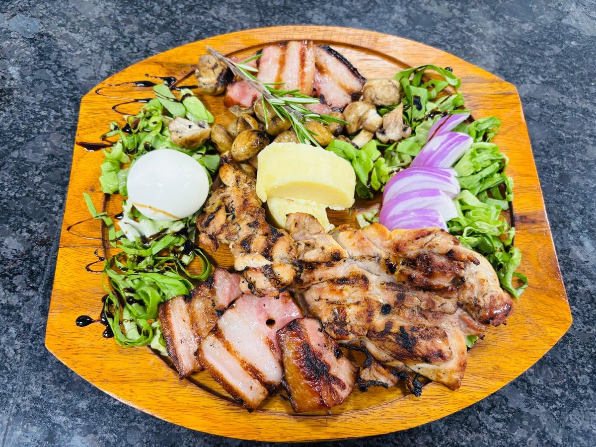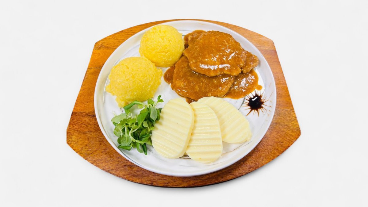 Cotlet, piept de pui, ficăţei de pui, câmăciori proaspeți, brânză de burduf, cartofi boierești, murături, mămăligā 650 g
