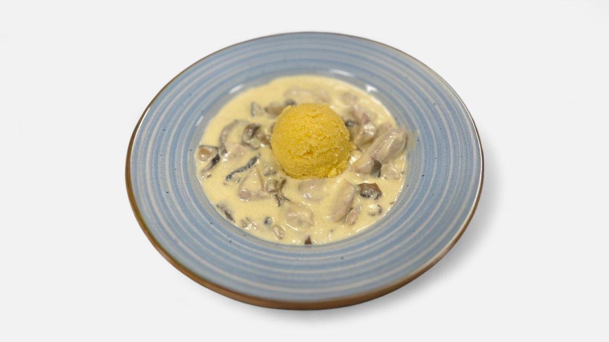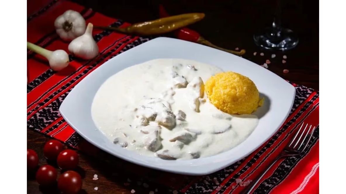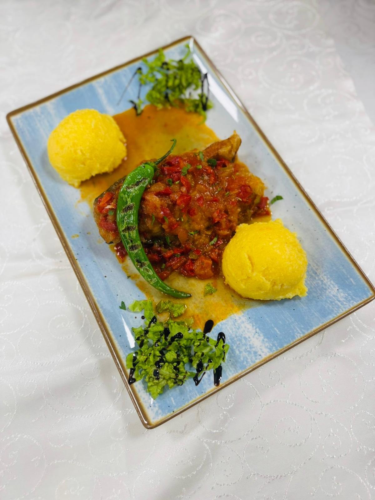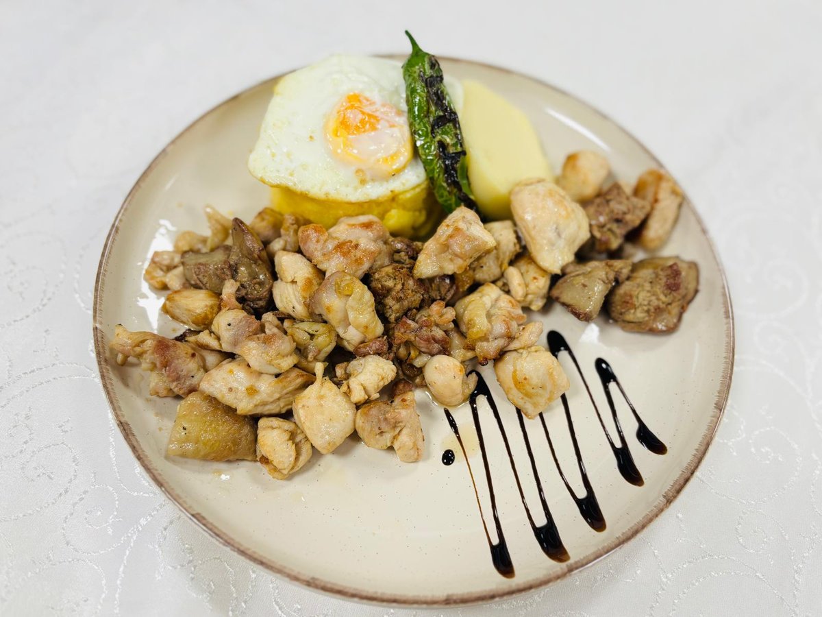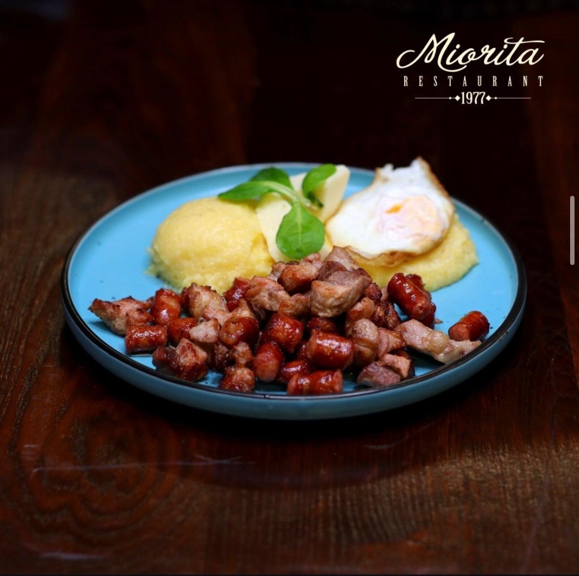 Piept de pui, ficat de pui, ou, brånză de burduf, mămăligă 400 g