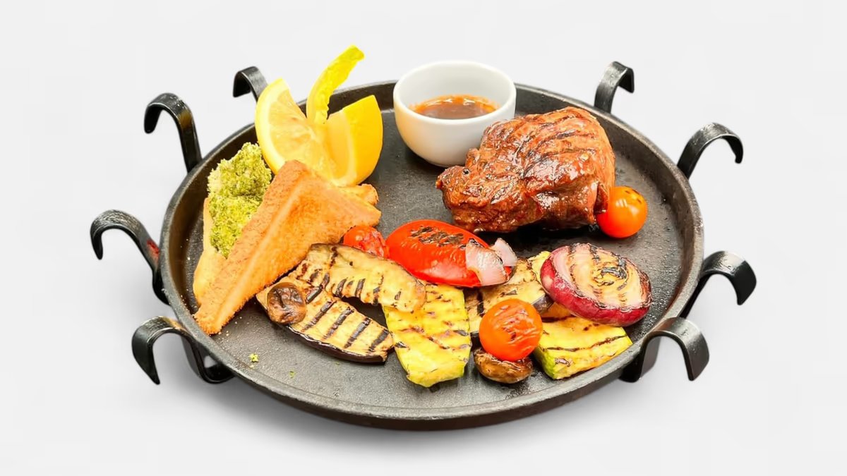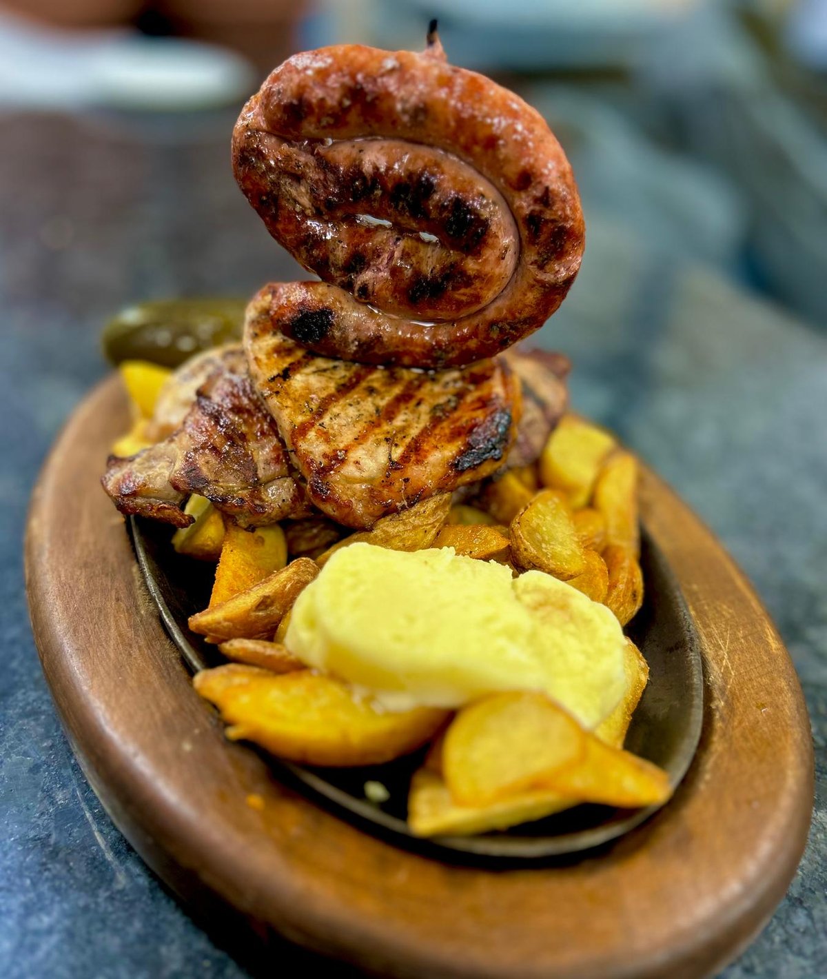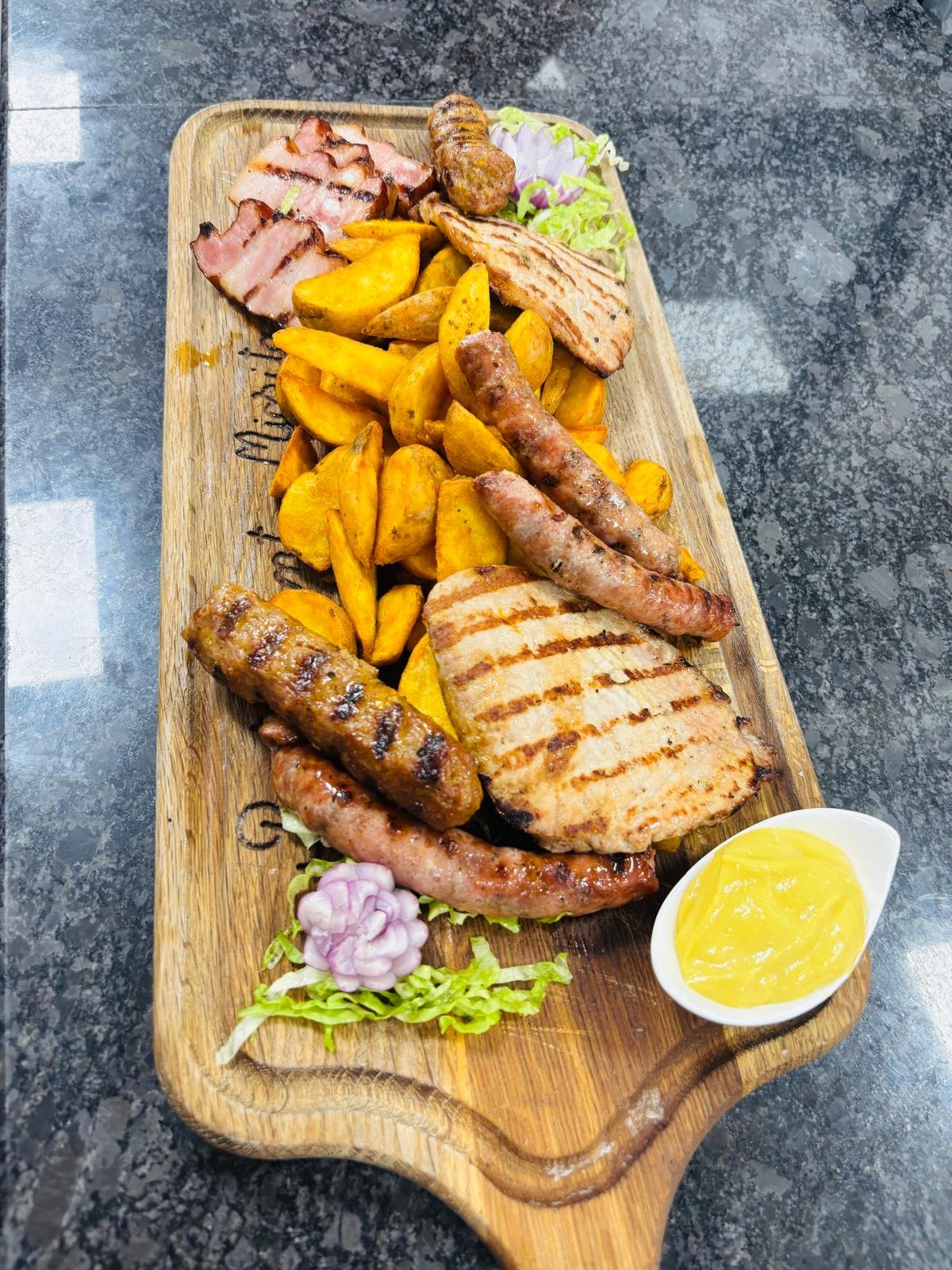 Cotlet, cârnați proaspeți, kaiser, cartofi wedges, murături, 2 mititei 600 g