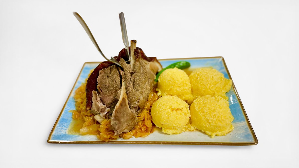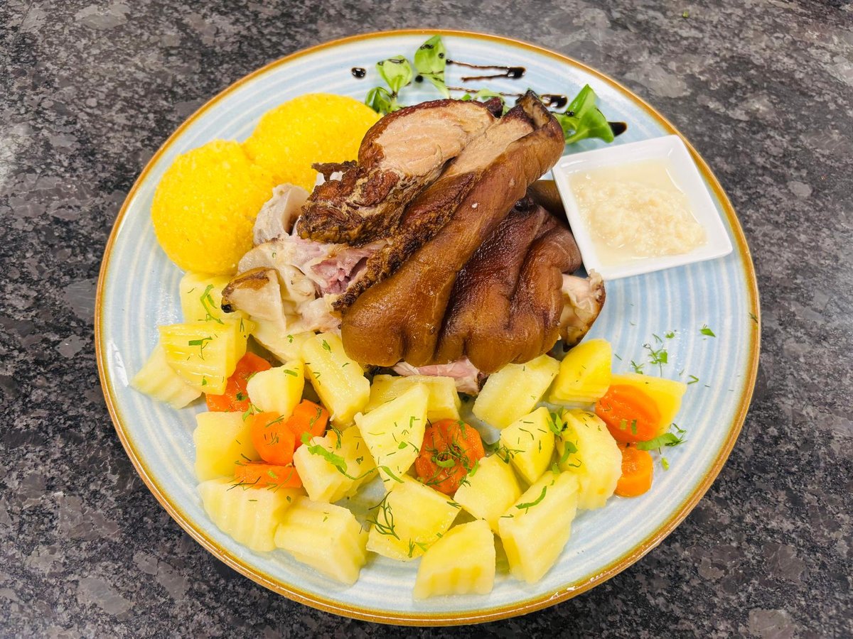 2x Pulpă de porc, cârnați, bacon, ficat de pui, brânză de burduf, mămăligă 450 g