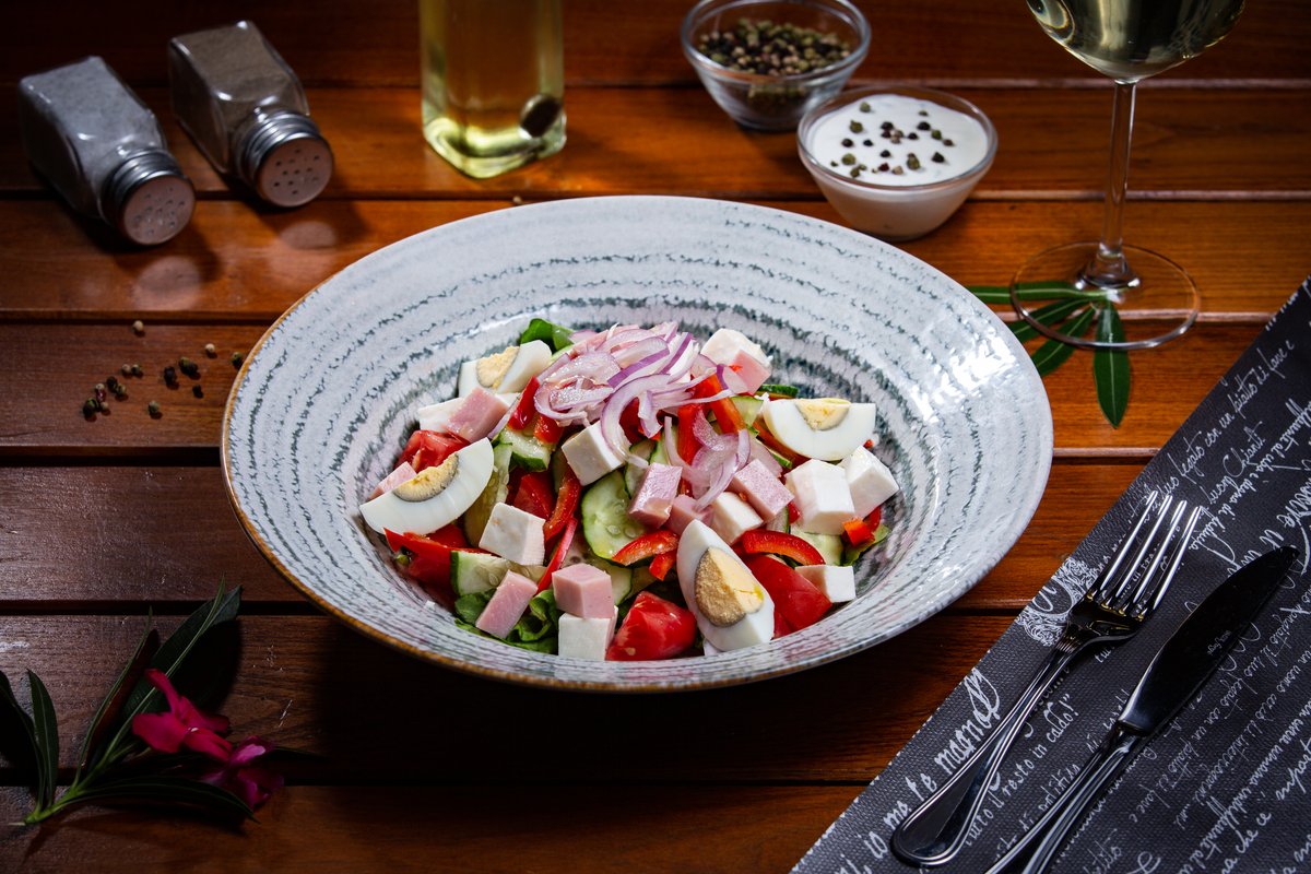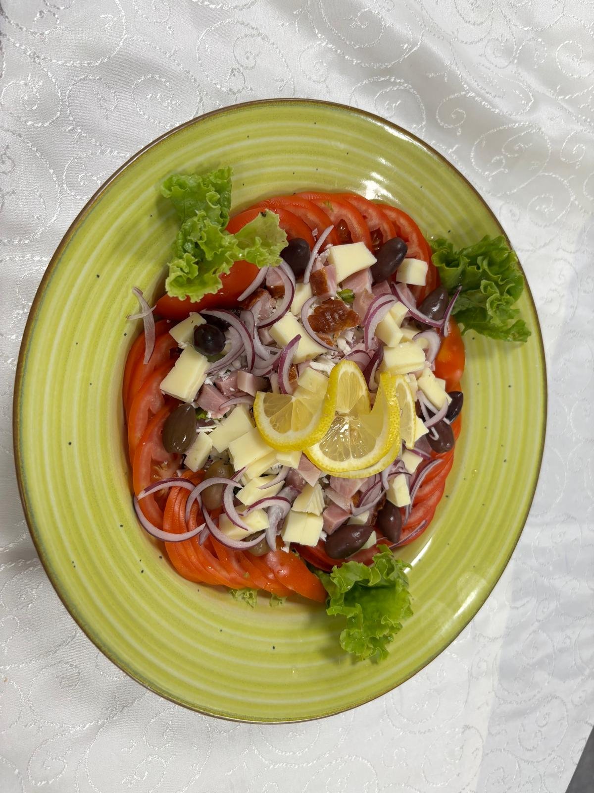 Șuncă presată, cașcaval, kaiser ciuperci, telemea, castraveți, roșii, măsline, ceapă, salată verde 450 g
