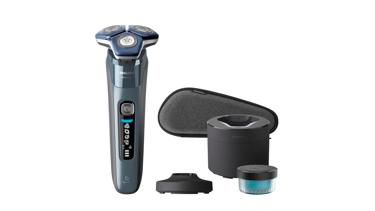 Aparat de barbierit Philips Shaver Seria 7000 S7882/55, barbierit umed/uscat, tehnologie SkinIQ, capete flexibile 360°, display LED, senzor Motion Control, senzor Power Adapt, lame auto-ascutire, 60 min, suport de incarcare, toc de transport, Ice Blue
