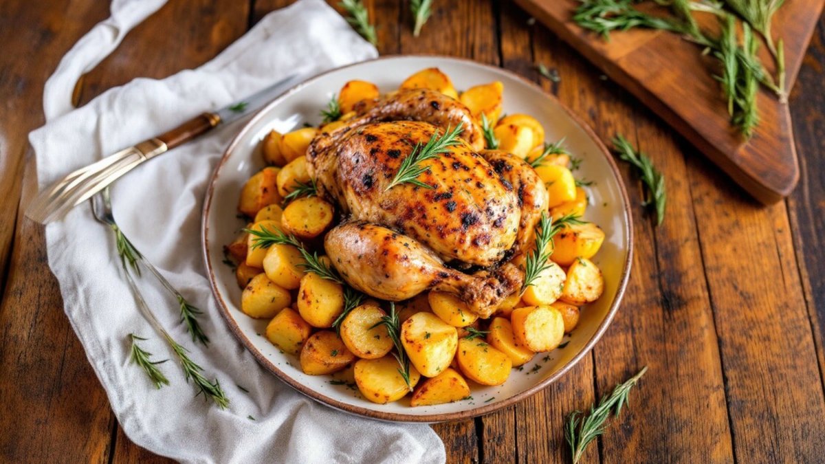 Cocoșel de pădure copt pe cartofi cu rozmarin