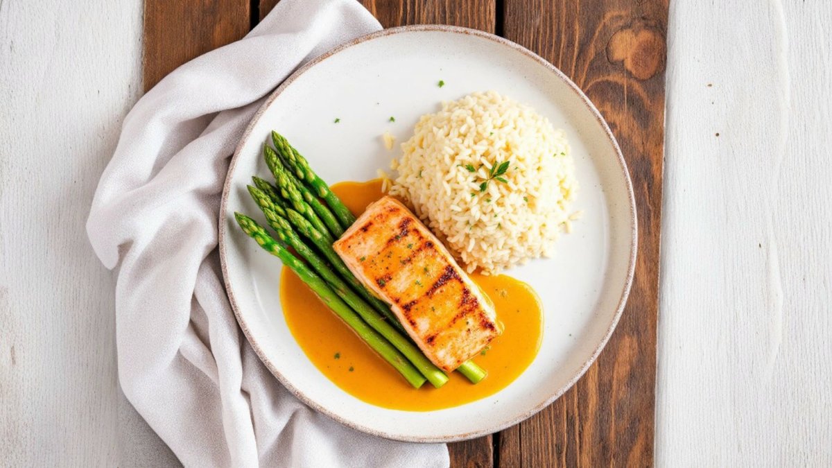 File de somon servit cu orez cu sparanghel și sos de șofran