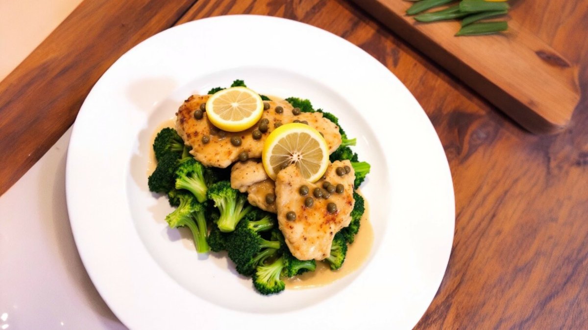 Tigaie de pui cu sos de lămâie și capere cu garnitură de broccoli