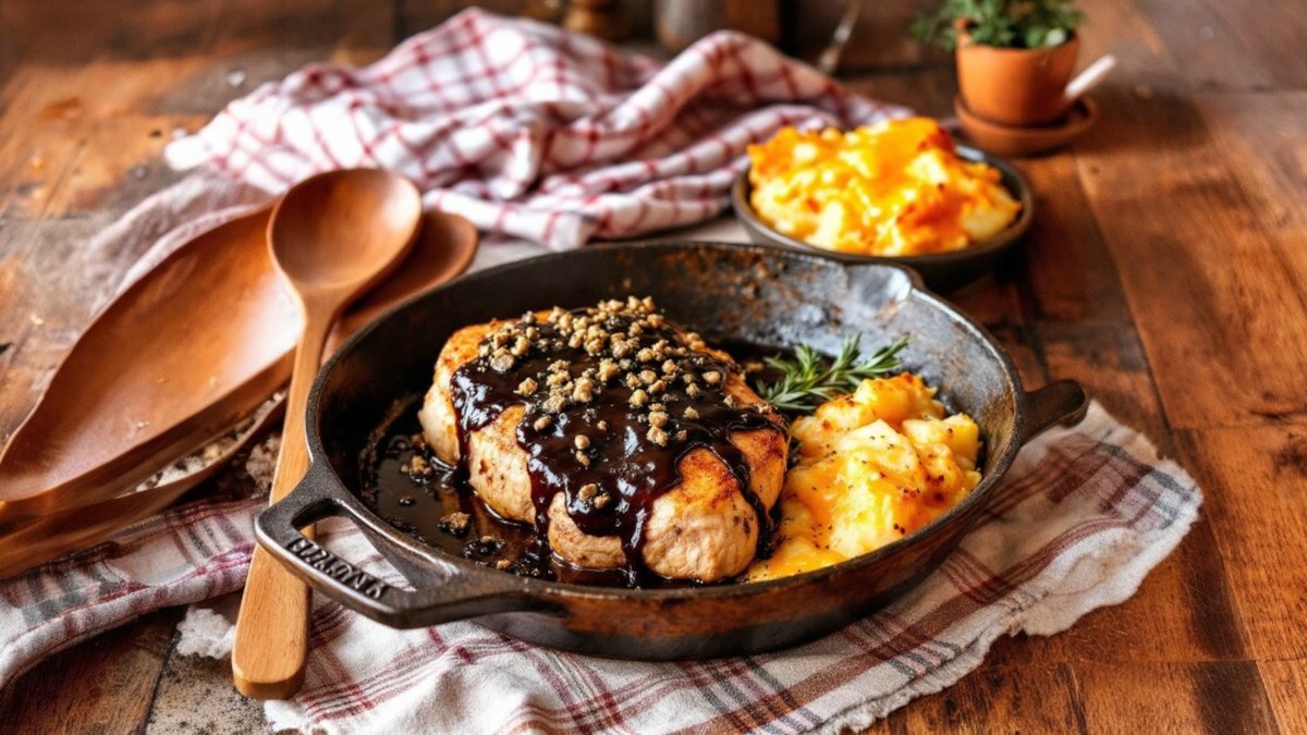 Tigaie cu Turnedo de porc, sos cu trufe și pure gratinat cu ceddar