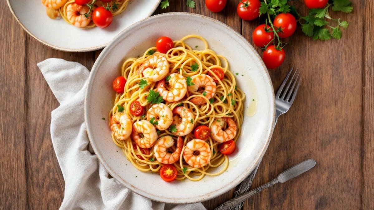 Spaghetti cu creveți Black Tiger și roșii cherry