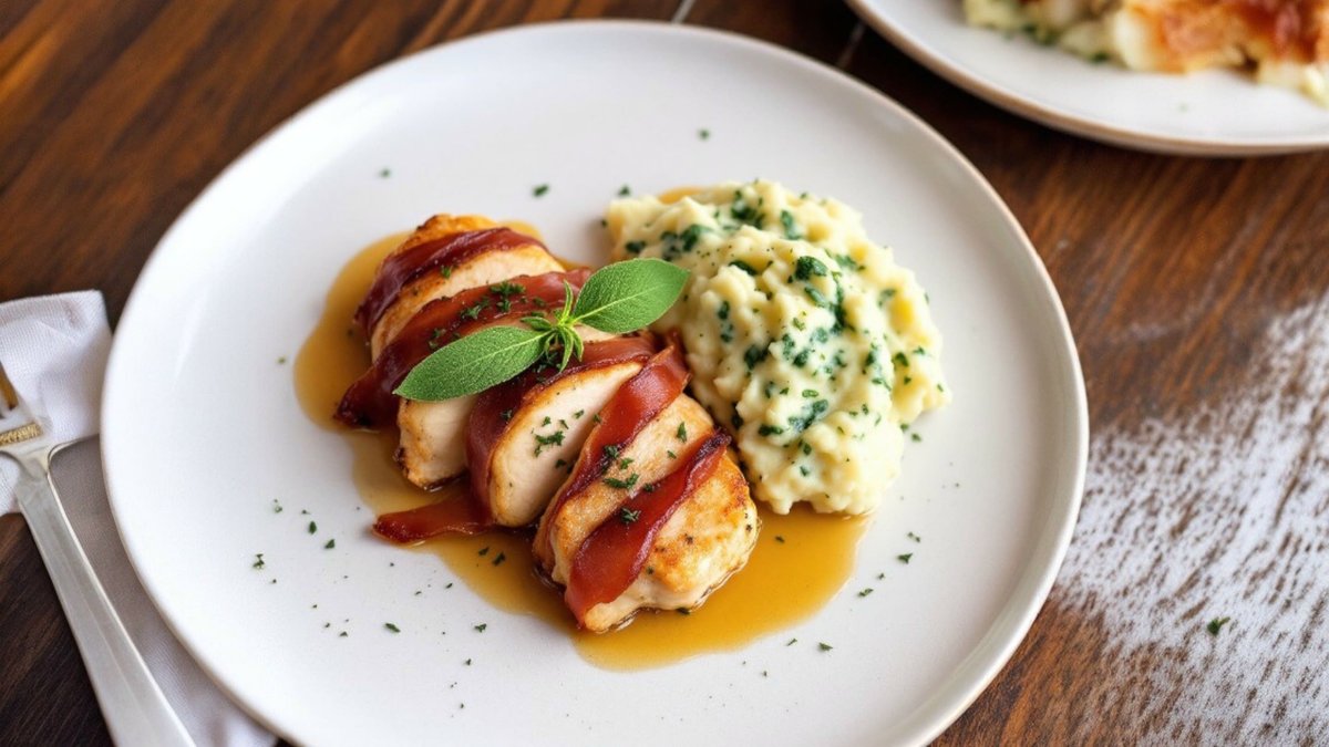 Saltinbocca de pui piure de cartofi cu spanac, prosciutto și sos de unt cu salvie