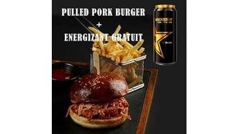 Pulled Pork Burger, cartofi prăjiți și Energizant