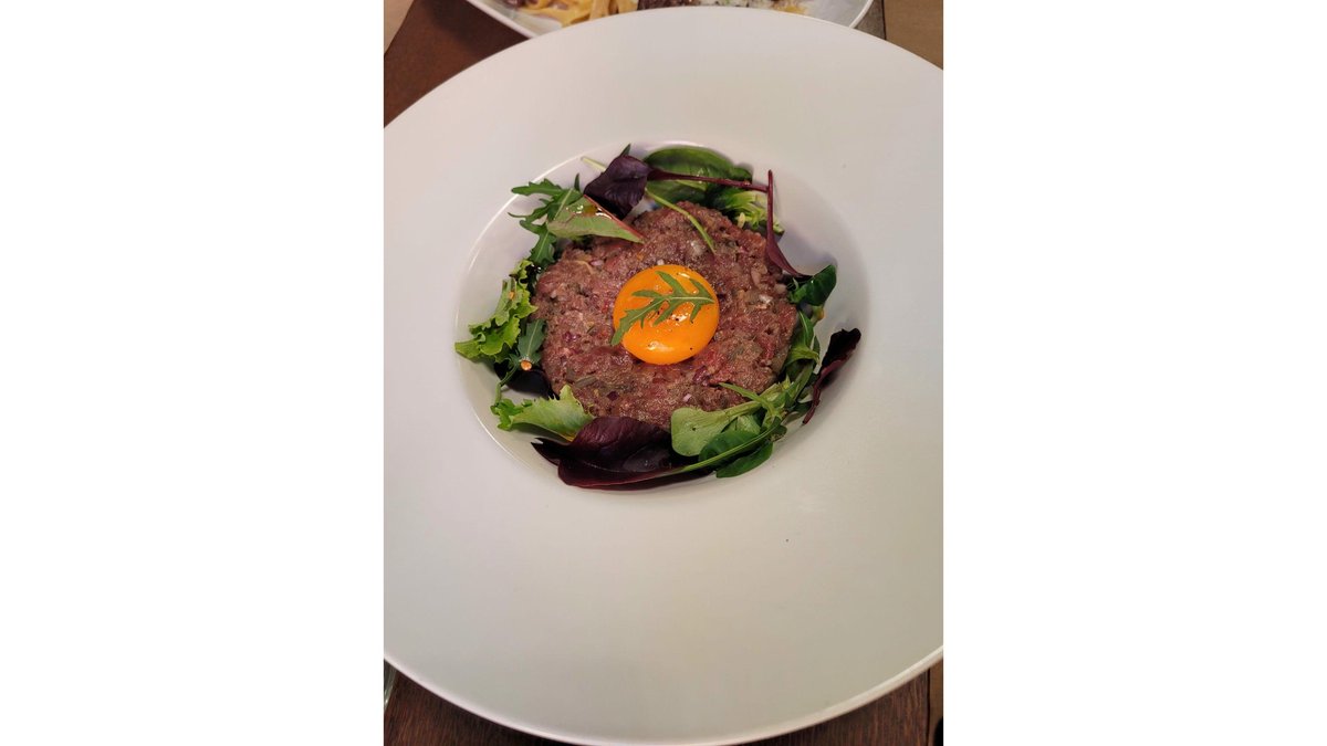Mușchi de vită, ceapă roșie, castravete murat, muștar, capere, gălbenuș de ou, pâine prăjită 220g
