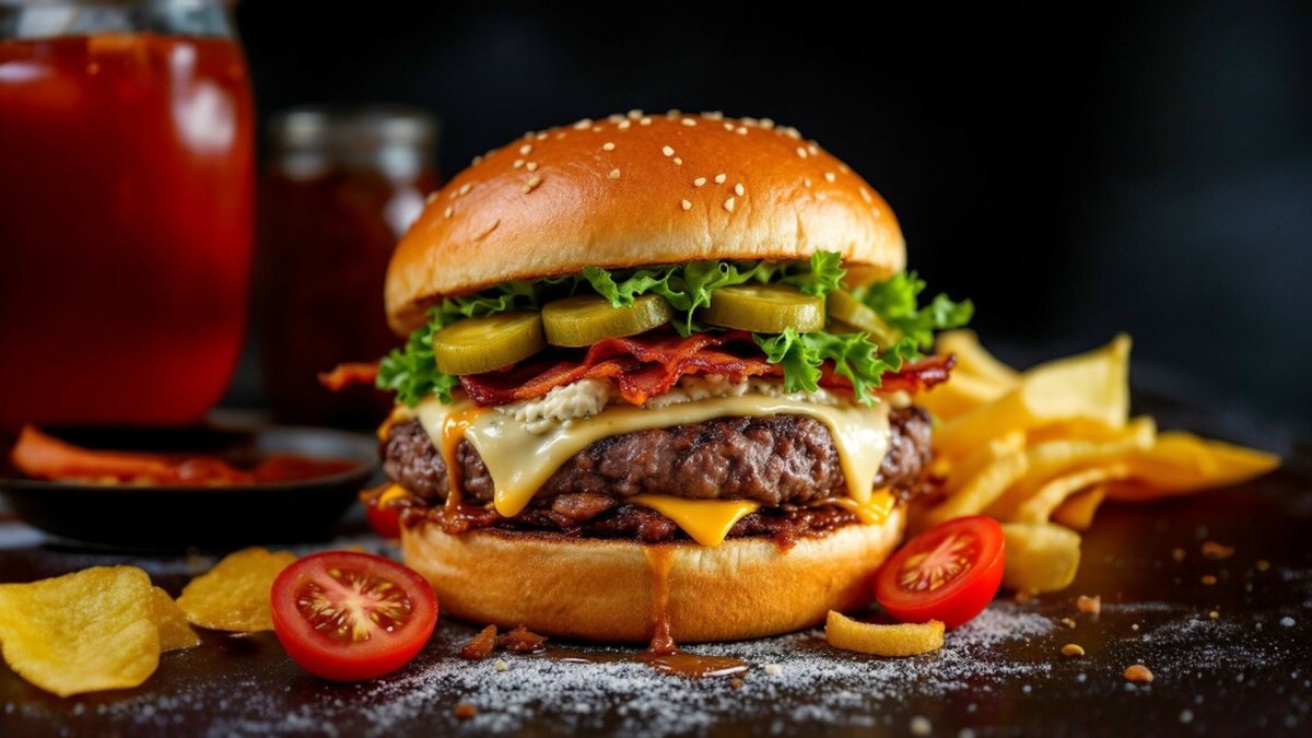 Chiflă pufoasă, antricot carne vită angus, bacon, castraveți murați, brânză cheddar, gorgonzola, cașcaval afumat, dulceață de ceapă, mix salată, sos usturoi, sos bbq, roșii, cartofi prăjiți 850g