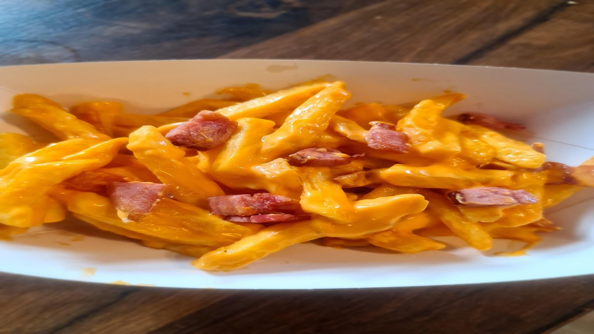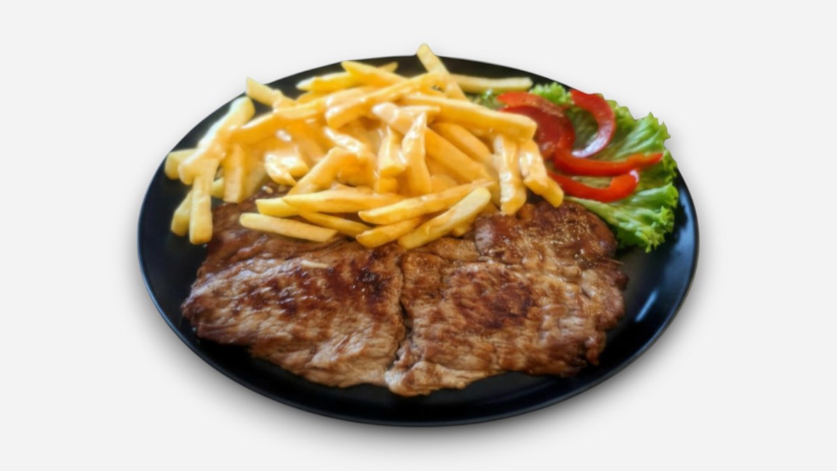 Ceafă la grătar 200gr, cartofi prăjiți 150gr, sos cheddar 100gr