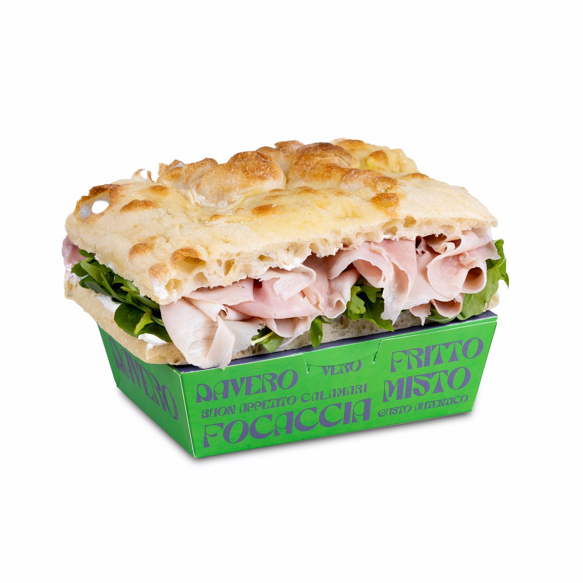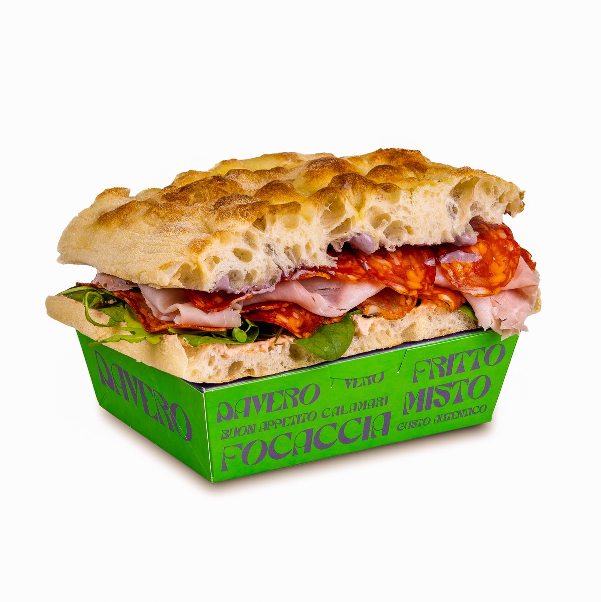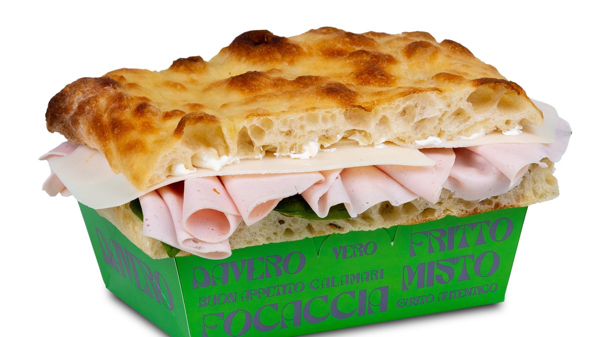 Focaccia, parizer, sos muștar, provolone, pastă brânză, baby spanac 500g