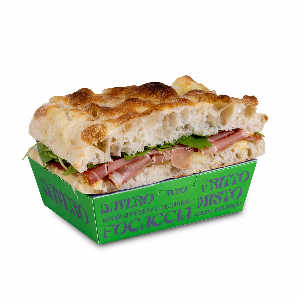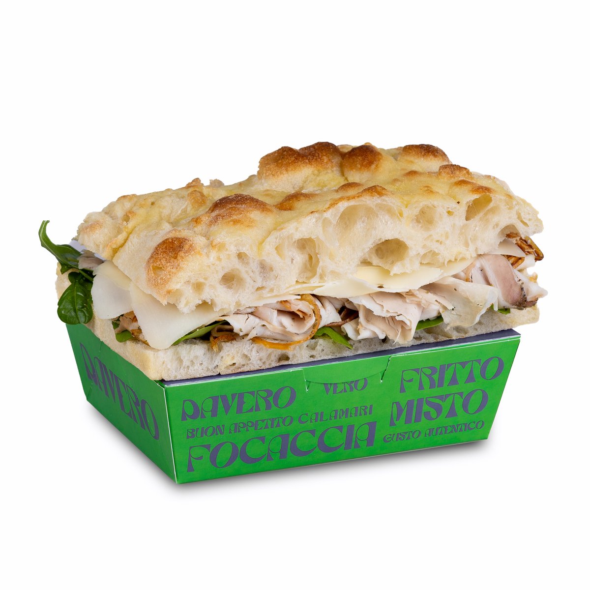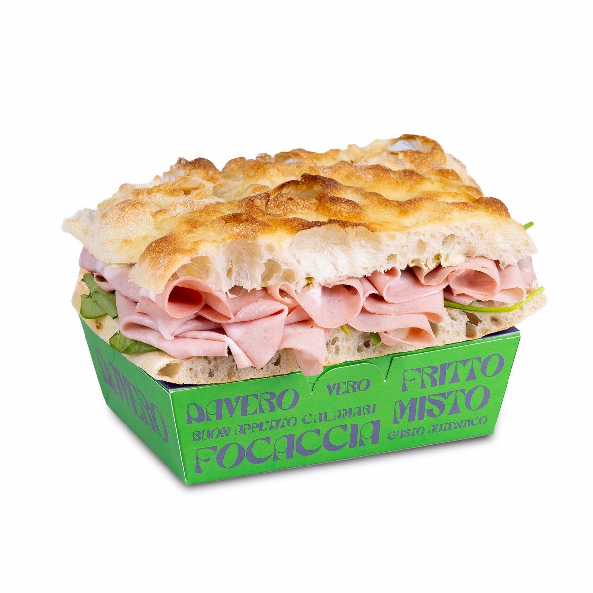 Focaccia, parizer, sos muștar, provolone, pastă brânză, baby spanac 500g