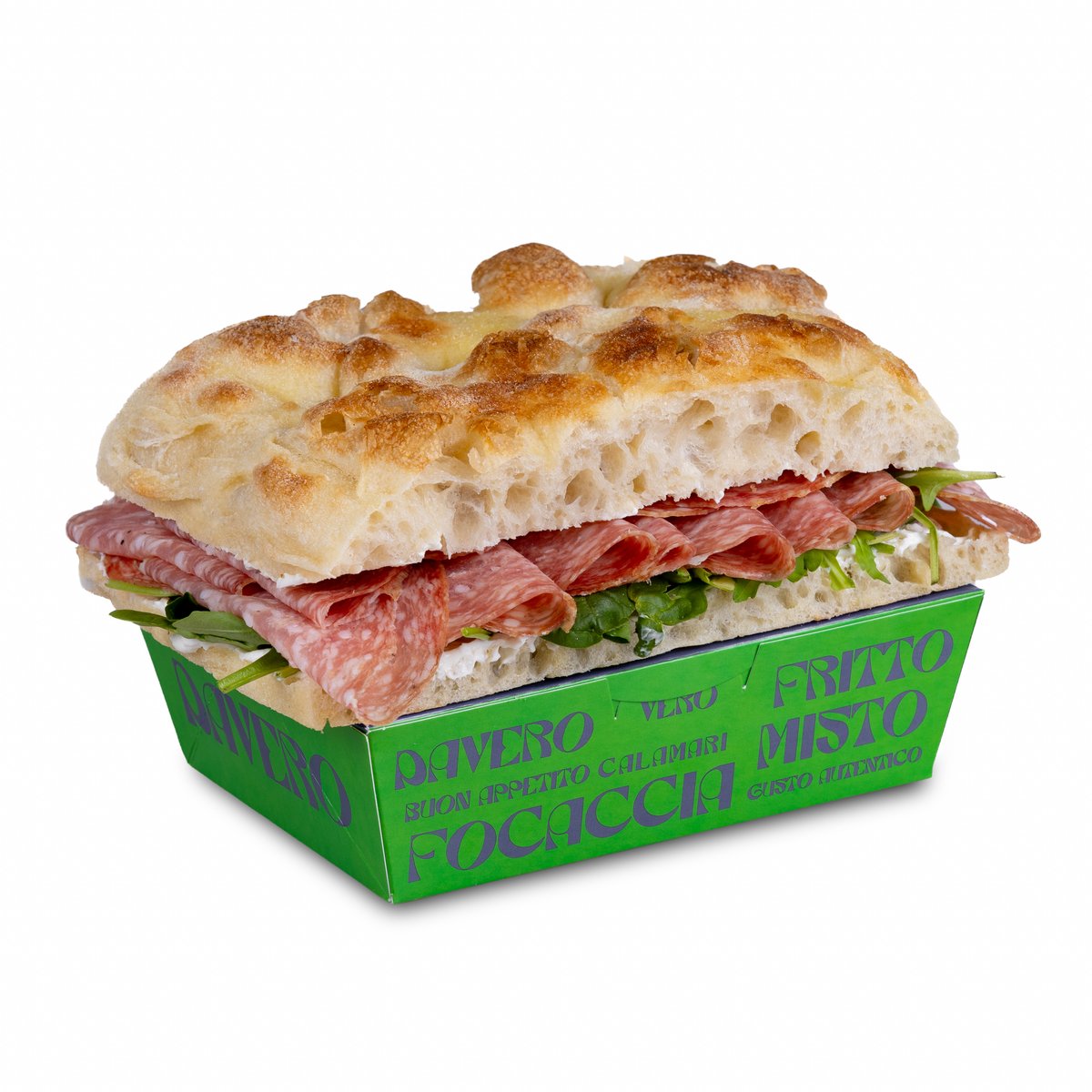 Focaccia, salam Milano, cremă de brânză cu gorgonzola, provolone, mix salată 500g