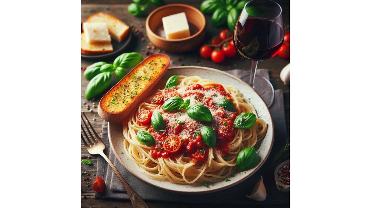 Spaghetti (200g), rosii pasate (150g) ingrediente : ceapa, usturoi, ulei masline, vin alb, oregano, busuioc (50g) (400g)