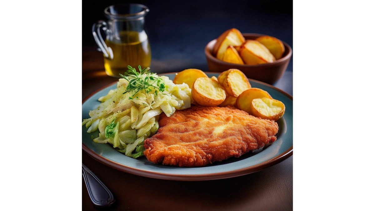 Snitel pui 150 gr., cartofi rustici 150 gr, salata de varza 100 gr.