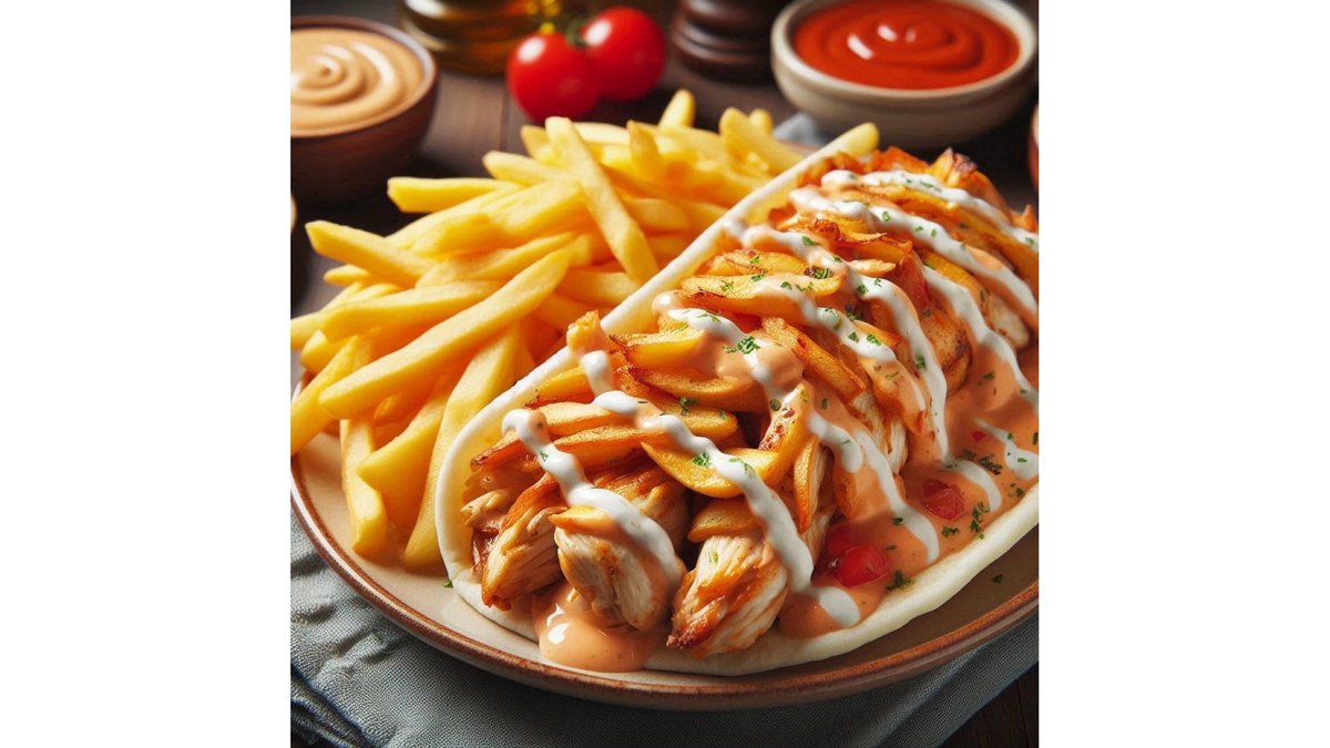 Carne rotisata de vita 100 gr, carne rotisata pui 100 gr, cartofi prajiti 200 gr,, telemea vaca 100 gr, salata de varza 100 gr, ketchup 50 gr, maioneza 50 gr.