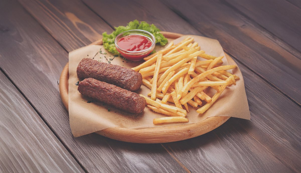 Mici porc vita 3 buc. ( 150 gr.), cartofi prajiti 200 gr., mustar 50 gr.