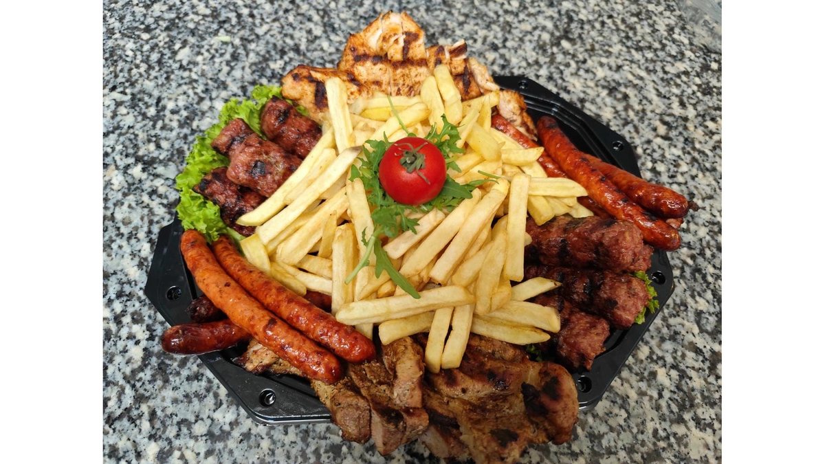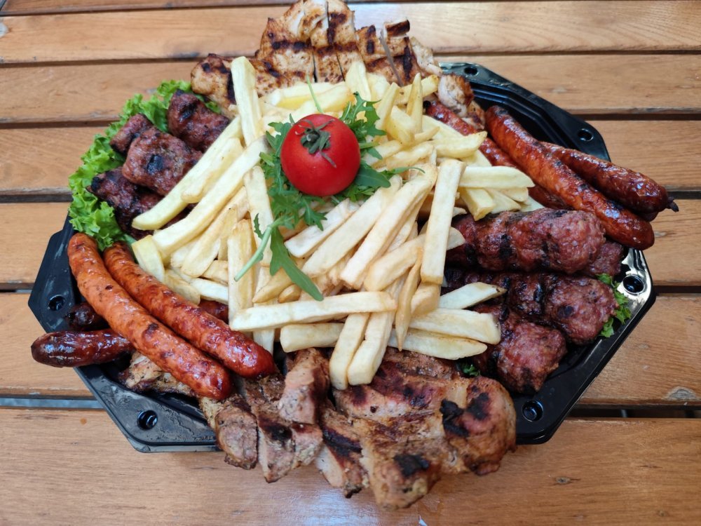8 mici, 1 ceafa de porc la grătar, 1 piept de pui la grătar, 8 cârnăciori, cartofi prăjiți, pâine 8 felii pâine, murături gramaj 1600 g