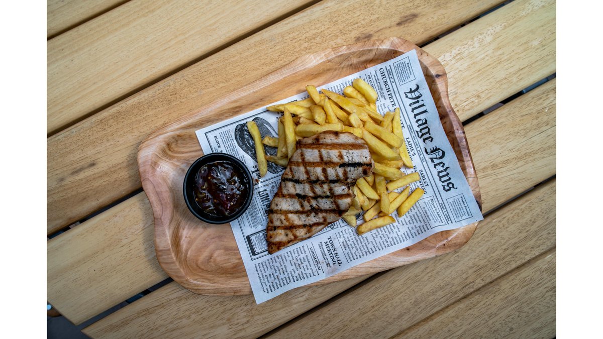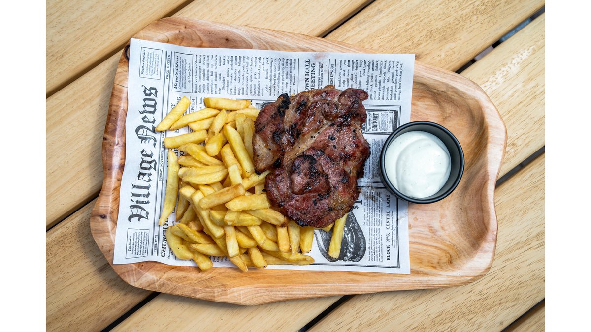 Ceafă de porc 220g, cartofi prăjiți 250, sos/murături la alegere, 2 felii de pâine 50g gramaj 300 g