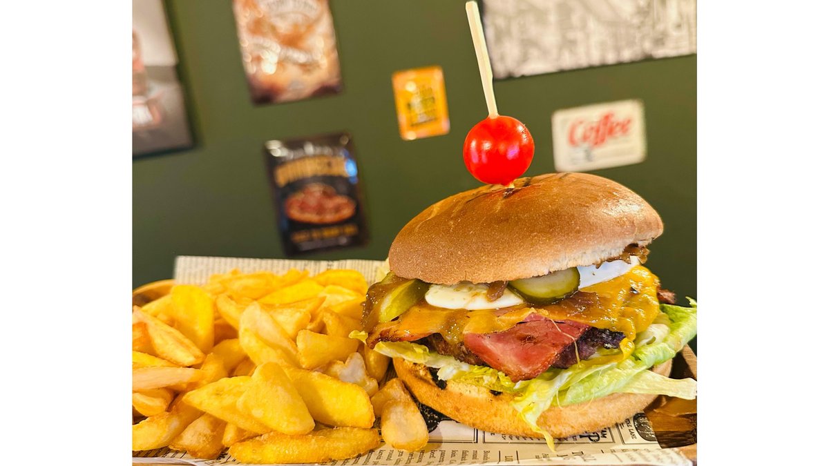Chifla artizanala cu seminte 70g , carne de vita 180g, cedar 30g, castraveti 25g, salata 20g, bacon 30g, sos ceapa 30g, sos french 30g, ou 50g, cartofi dippers 200g , 670g