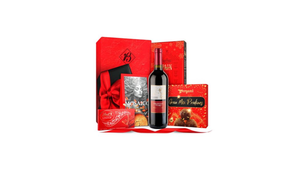 90,49 RON93,94 RONCos pentru cadou Rosato Regalo, vin rosu Grappolo D-oro, ciocolata Lindt, turta dulce, ciocolata calda