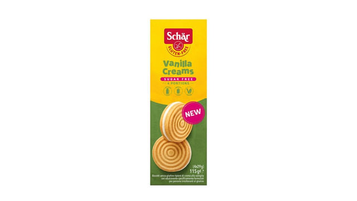 Biscuiti fara gluten cu umplutura de crema de vanilie Schar, 115 g