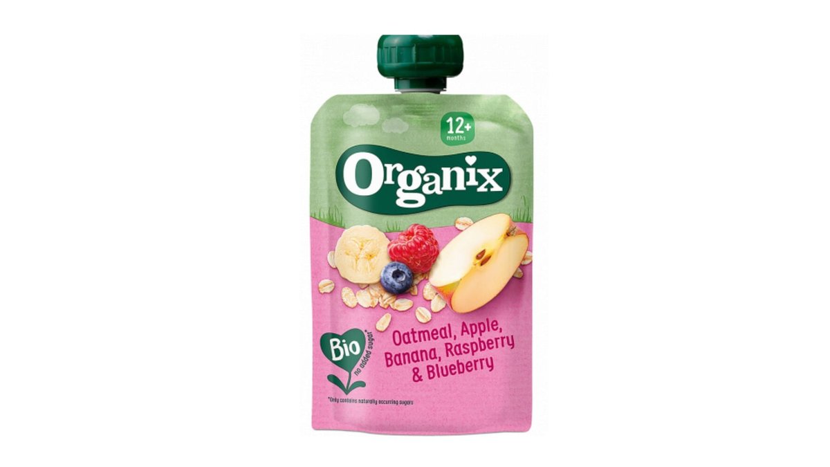 Piure de ovaz, mere, banane, zmeura si coacaze Organix, de la 12 luni, 100 g