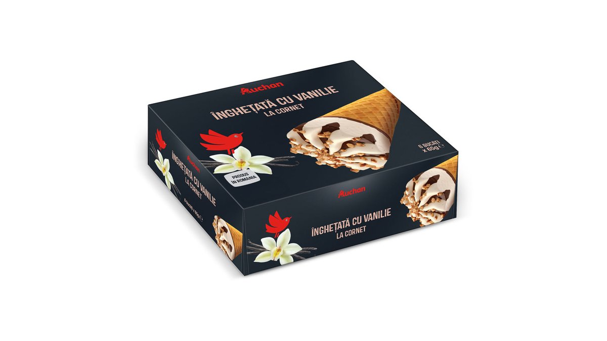 Pachet de inghetata la cornet cu vanilie, arahide si glazura de cacao Auchan, 6 x 65 g