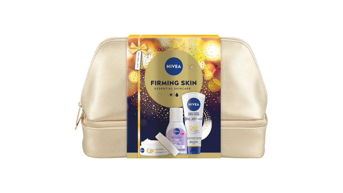Set pentru cadou Nivea Q10: Crema zi anti-rid SPF 15, 50 ml + Crema maini anti-imbatranire, 100 ml + Apa micelara ten sensibil, 100 ml + geanta