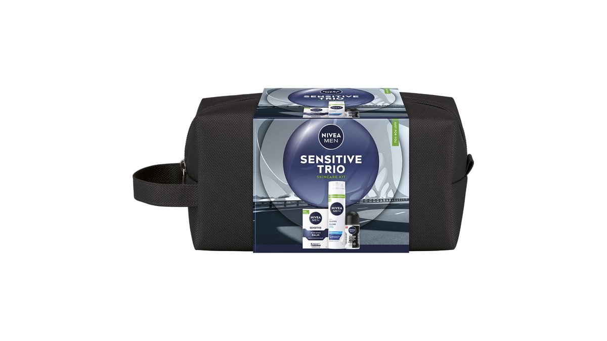 Set pentru cadou Nivea Men Sensitive: Balsam dupa ras, 100 ml + Gel pentru ras, 200 ml + Deodorant roll-on Invisible Power, 50 ml + geanta