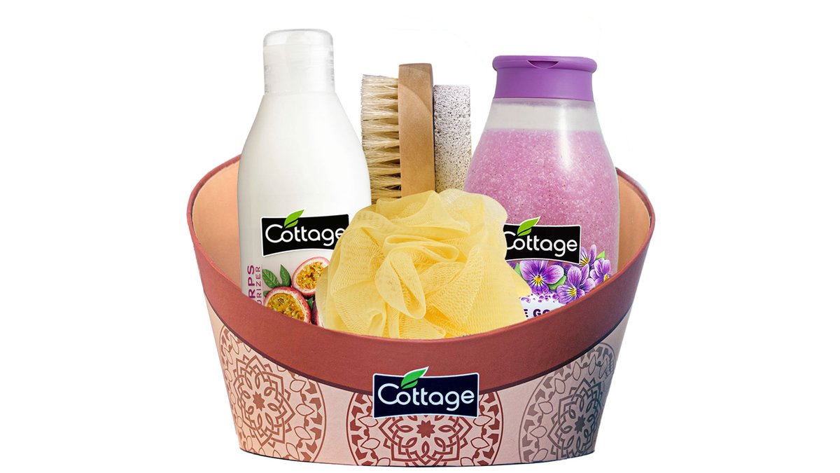 Set pentru cadou Cottage: Scrub pentru dus Violete, 270 ml + Balsam Smoothie, 200 ml + Burete + Perie & piatra