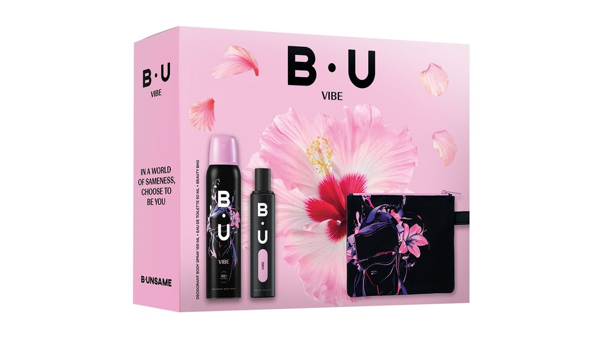 Set pentru cadou BU Vibe: Apa de toaleta, 85 ml + Deodorant spray, 150 ml + Geanta cosmetica