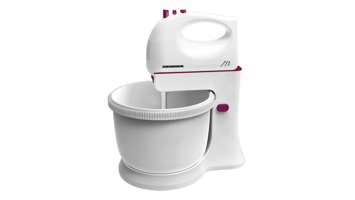 Mixer cu bol Heinner Charm HMB-350BG, 300W, 5 viteze + turbo, teluri si palete inox, bol rotativ 2.5l, alb/visiniu