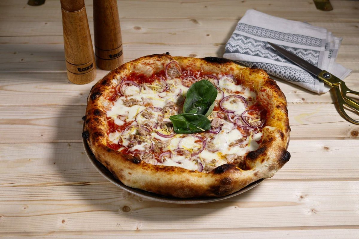 Aluat 280g, Sos de roșii 100ml, Mozzarella 100g, Ceapă Fresh 20g, Ton 130g, Parmezan 10g, Busuioc 3g, Oregano 3g, Ulei Măsline 3ml