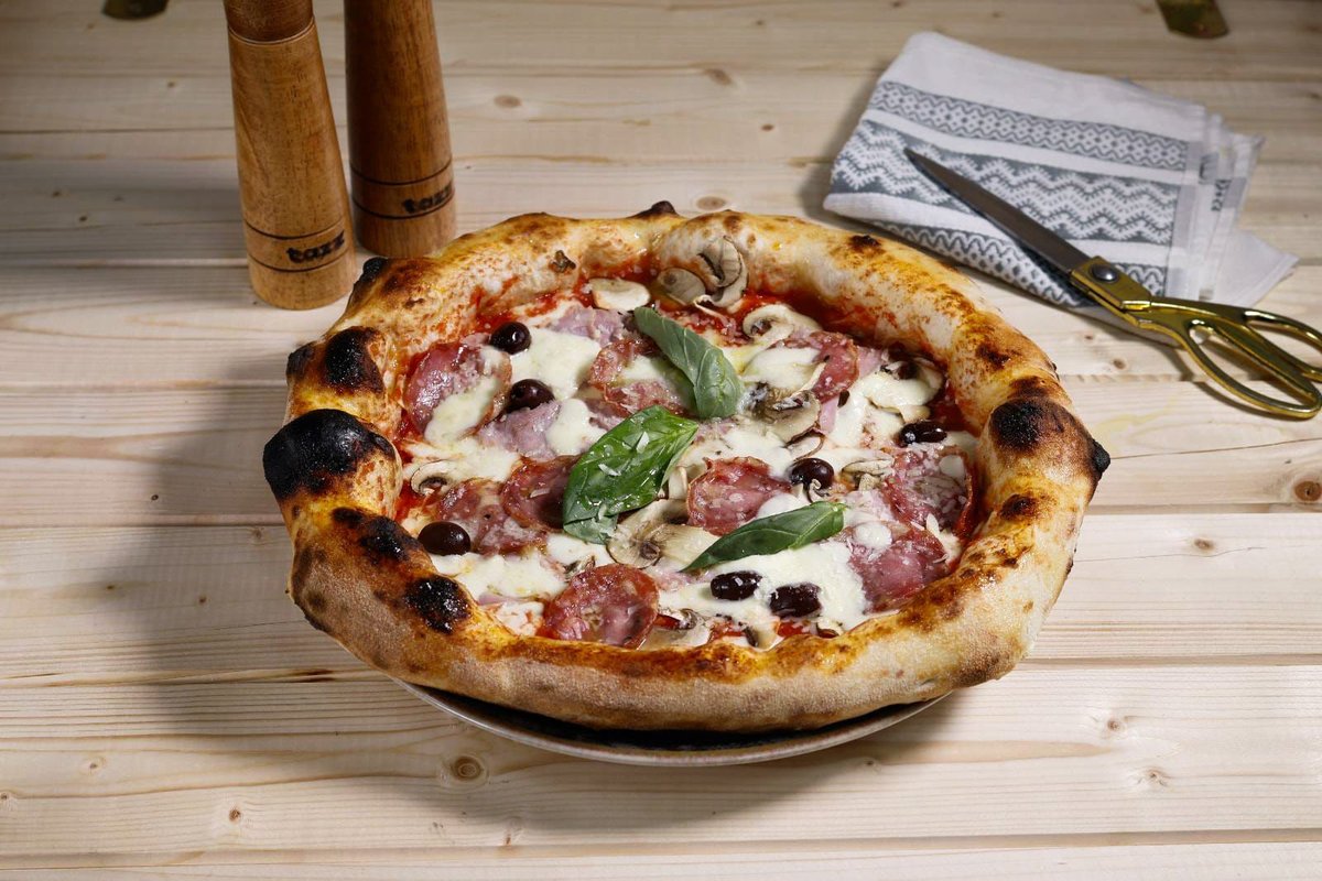 Aluat 280g, Sos de roșii 100ml, Mozzarella 100g, Prosciutto Cotto 100g, Salam Napoli 30g, Ciuperci 60g, Măsline Kalamata 30g, Parmezan 10g, Busuioc 3g, Ulei Măsline 3ml 773g